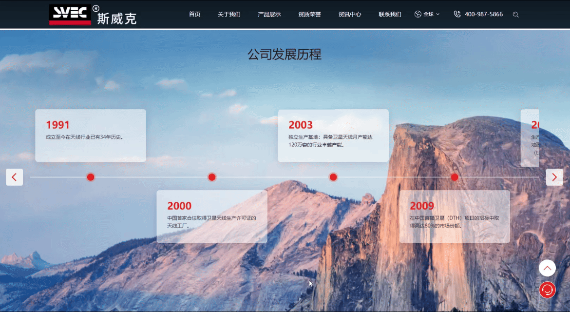 在公司發(fā)展歷程模塊,用時(shí)間軸節(jié)點(diǎn)串聯(lián)起企業(yè)的發(fā)展史,簡單明了的展現(xiàn)了公司的發(fā)展歷程。